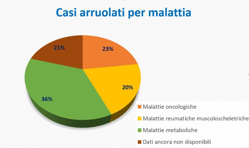 Al 26 novembre sono 558 casi reclutati nell’ambito del progetto LIFEMap: 256 sono stati reclutati dall’Istituto Giannina Gaslini di Genova, 212 dall’AORN Santobono-Pausilipon di Napoli, 24 dall’Asl di Teramo, 65 dall’Università di Padova. Le patologie oggetto di studio sono: 128 malattie oncologiche, 113 malattie reumatiche muscoloscheletriche, 202 malattie metaboliche, per 115 i dati non sono ancora disponibili (vedi grafici sotto).